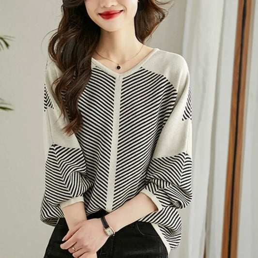 2024 New Spring Striped Tops Women Pullover Long Sleeve V Neck Striped Loose Office Lady Korean Style Print Lively Popularity T-Shirts