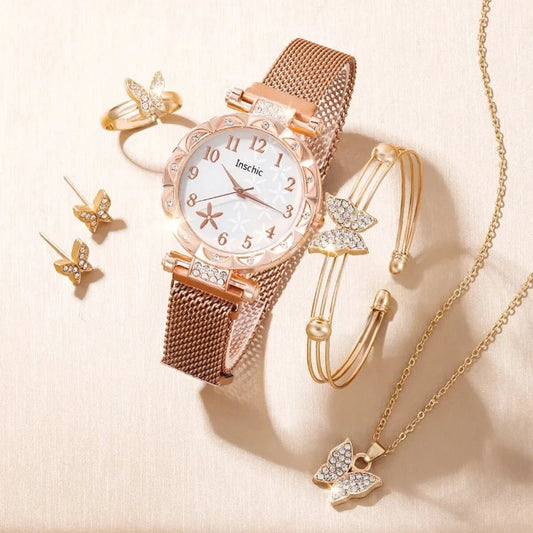 6 PCS New Women's Fashion Digital Rhinestone Star Quartz Watch Luxury Atmosphere Butterfly Jewelry Bracelet Birthday Gift Set