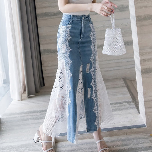 Spring Fashion Long Maxi Denim And Lace Fish Tail Skirt For Women S-2XL Mermaid Style High Waist Summer