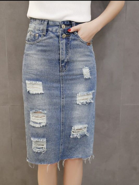 Summer 2023 Denim Teen Skirt High Waist Holes Back Slit Knee-length Midi Skirt Preppy Style