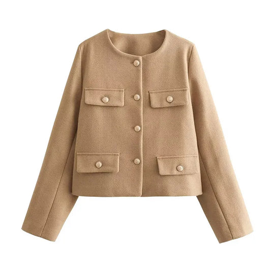 Fashion Tweed Jacket For Women Autumn Winter Long Sleeve Single Breasted Cropped Coat Female Solid O-neck Pocket Outwear Top