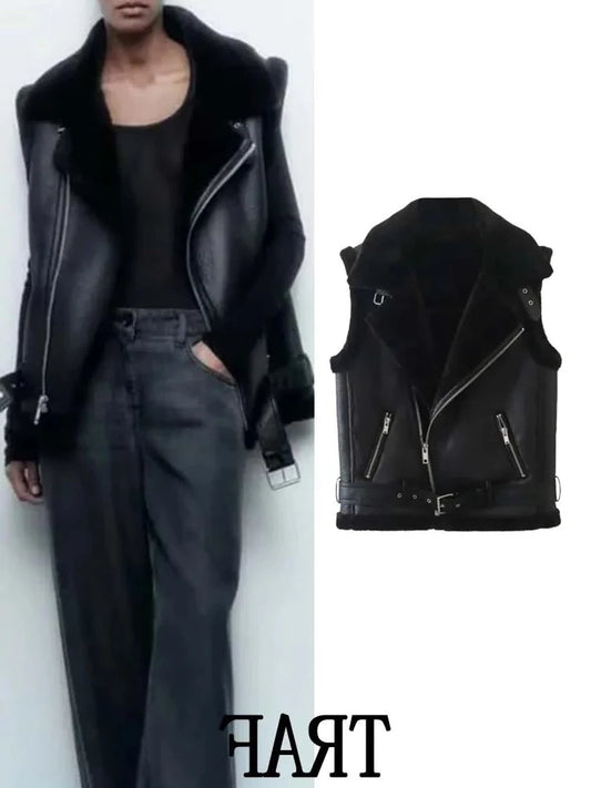 TRAF 2023 Woman Winter Vest Coat, Cotton Imitation Leather Vests, Sleeveless Jacket, Windproof Casual Warm Trench Coats, Winter Fashion, Women's Outerwear