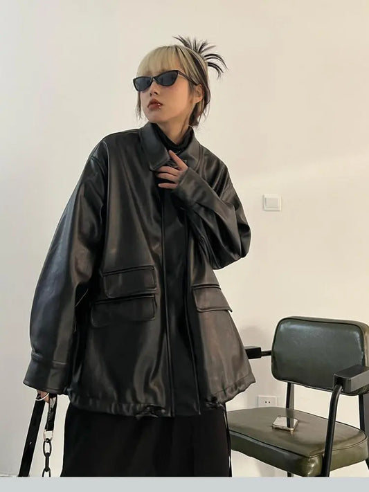 Y2K Gothic Streetwear Black PU Leather Coats and Jackets for Women with Long Sleeve Pocket Details Ideal for Autumn and Spring Outerwear