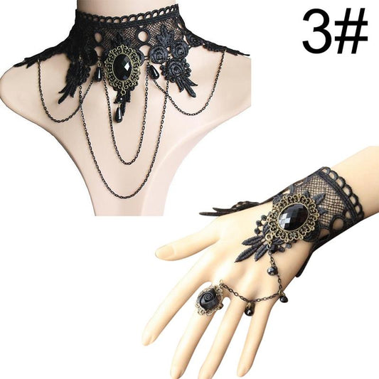 Gothic Harajuku Style Jewelry Set Vintage Lace Choker Necklace Ring Hand Bracelet Drop Earrings Set Jewelry Accessories Party Dress Up