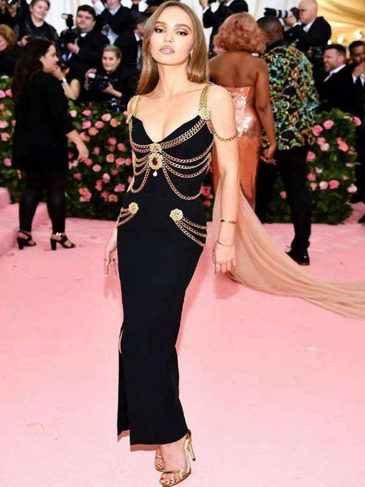 Beading Bandages Dress New Women Sexy Chain Spaghetti Strap Clothes Club Party Long Dresses