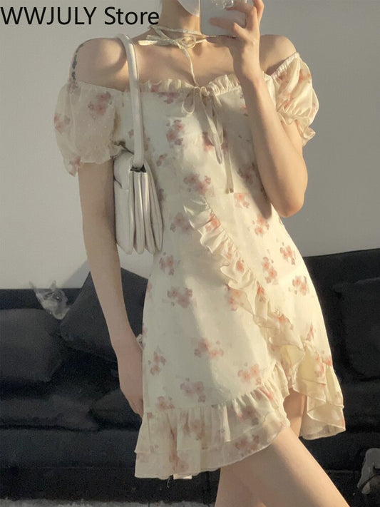 Floral Elegant Short Sleeve Dress Women Casual 2023 Summer Sexy Party One Piece Dress Korean Fashion Beach Vintage Midi Dress