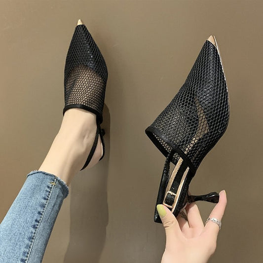 High Heels Sandals Woman Mesh Summer Shoes Women Pumps Pointed Toe Ankle Buckle Strap Ethnic Embroidery Flower Handmade