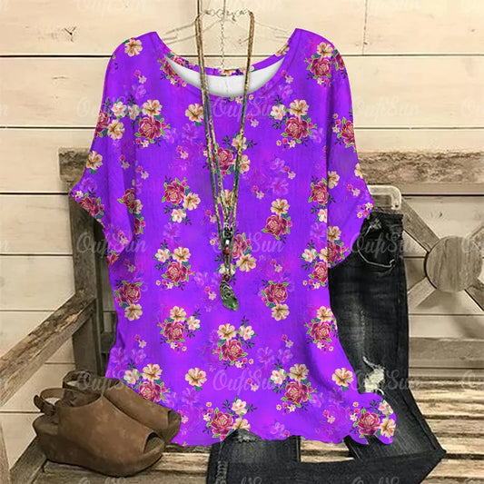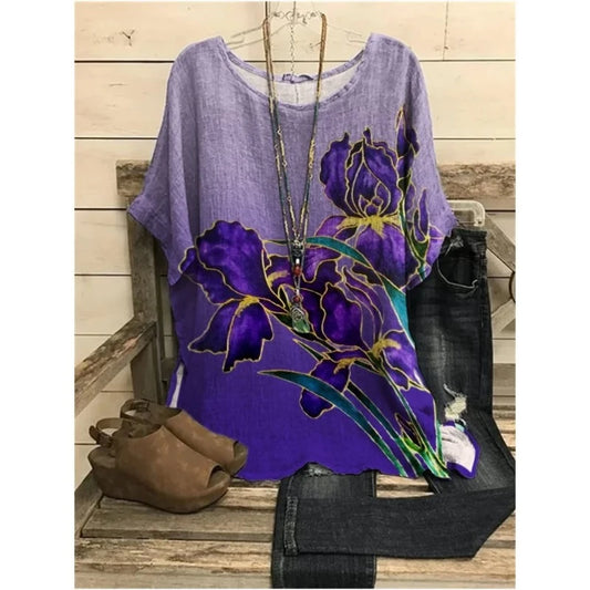 2024 Round Collar Flower Print Tops - Spring/Summer Edition, Loose Fit, Short Sleeves, Oversized Tee Shirt in Fashionable Sizes 5XL