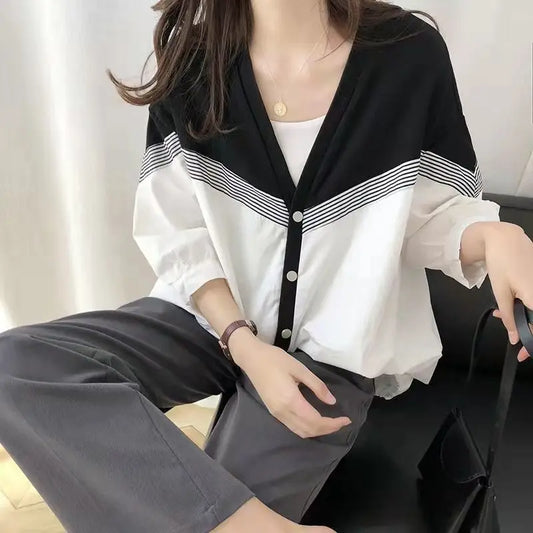 Fashion Patchwork Striped Blouse Women New Classic Contrast Color V-neck 3/4 Sleeve Korean Casual Single-breasted Lady Shirt