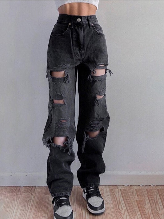 Trendy Streetwear Fashion Brown Blue Ripped Vintage Woman's Distressed Jeans High Waist Hole Hip Hop Straight Denim Trousers for Ladies