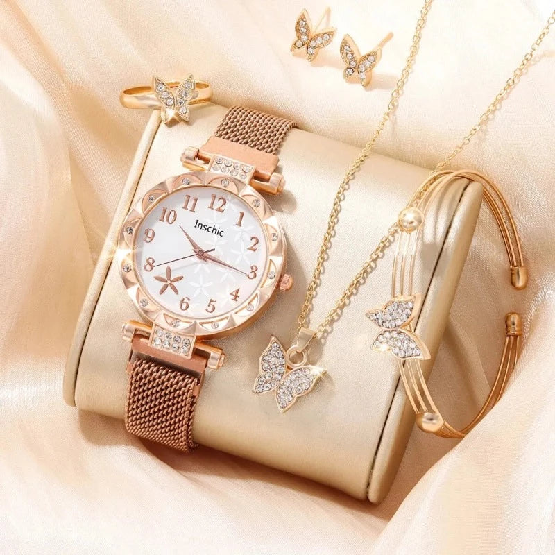 6 PCS New Women's Fashion Digital Rhinestone Star Quartz Watch Luxury Atmosphere Butterfly Jewelry Bracelet Birthday Gift Set