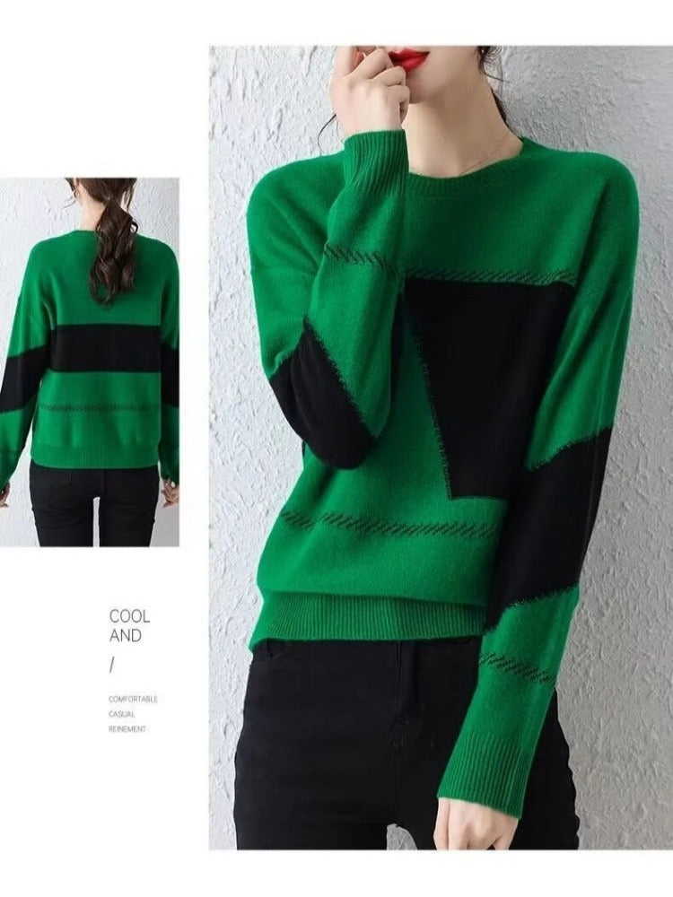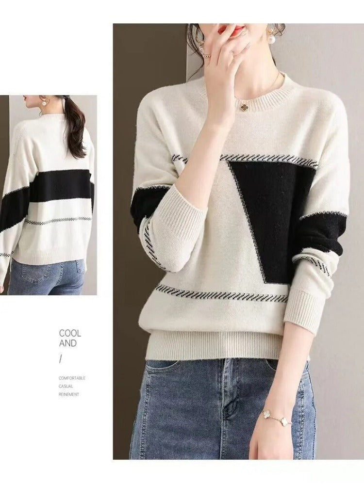 Elevate your style with this Korean Fashion O-Collar Pullover. This autumn-winter knitting sweater features striking color blocking,adding a trendy and dynamic element to your outfit.