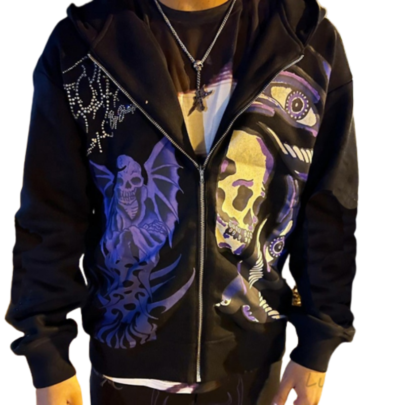 Men's Rhinestone Skull Purple Print Streetwear Oversized Hoodie Men's Jacket Jacket Goth Harajuku Y2k Clothes Grunge Zip Hoodie